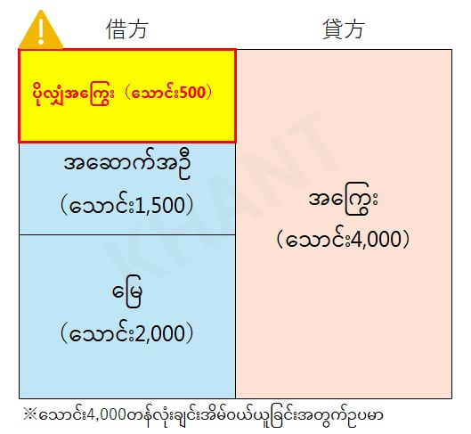 သောင်း4,000တန်အိမ်ကိုDownpaymentမရှိဘဲFull Loanနဲ့ဝယ်လိုက်တယ်ဆိုပါစို့။ အဲ့ဒါဆိုရင် B/Sဇယားရဲ့ပိုင်ဆိုင်မှုဘက်မှာ”အိမ်”တိုးလာပြီး၊ တခြားဘက်မှာ”အကြွေး”ကလည်းတိုးလာပါတယ်။ အိမ်တန်ဖိုးကလည်းသောင်း4,000၊ အကြွေးကလည်းသောင်း4,000ဖြစ်လို့ အသားတင်ပိုင်ဆိုင်မှုကတိုးမလာသေးပါဘူး။