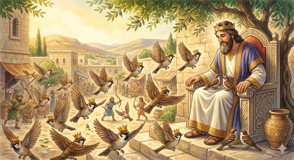ဟိုးရှေးရှေးတုန်းက ပညာရှိဘုရင်ကြီးတစ်ပါးဟာ နေပူထဲမှာခရီးသွားနေရင်း ပင်ပန်းနွမ်းနယ်နေခဲ့ပါတယ်။ အဲဒီအချိန်မှာ စာကလေးအုပ်စုတစ်စုဟာ သူတို့ရဲ့အတောင်ပံတွေကို ဖြန့်ပြီး ဘုရင်ကြီးကို နေပူဒဏ်ကနေကာကွယ်ပေးဖို့ အရိပ်လုပ်ပေးခဲ့ကြပါတယ်။